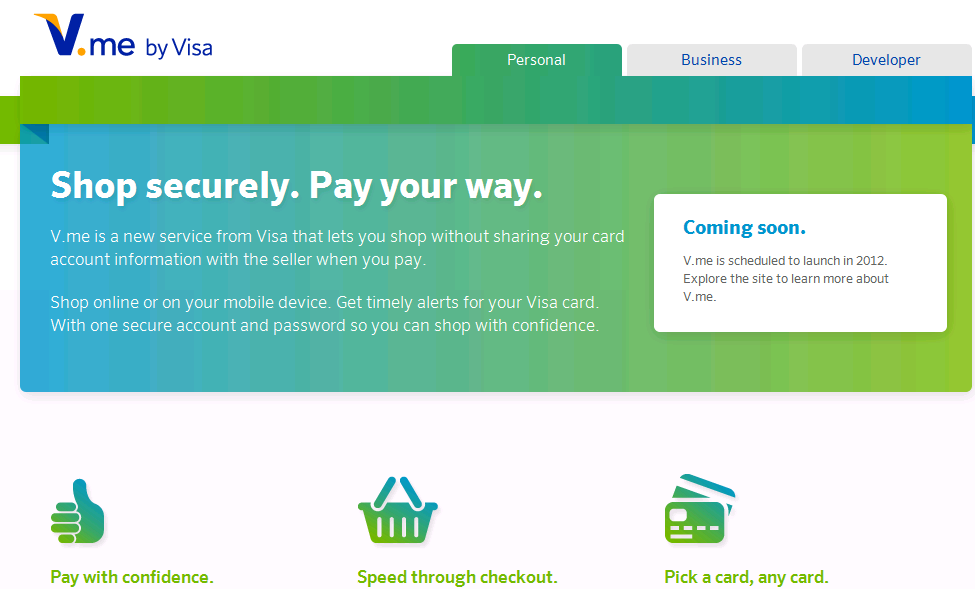 V.me le nouveau service de portefeuille digital de Visa lancé début 2012 sera ouvert à d’autres cartes de paiements (Mastercard et American Express) et sera accessible via une simple connexion par nom d’utilisateur et mot de passe.