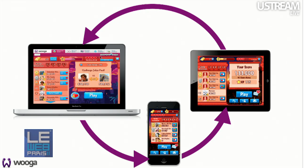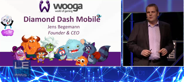 Sur la scène du Web11 Jens Begemann, CEO de l’allemand Wooga, le premier éditeur de jeux sociaux Européen : avec 7,2 Millions de joueurs quotidiens (DAU) et 34,5 joueurs mensuels (MAU) a dévoilé, outre la version très attendue de Diamond Dash sur IOS, une technologie de synchronisation automatique du jeu, des scores et des notifications de Diamond Dash sur PC, Iphone et Ipad basée dans le cloud .