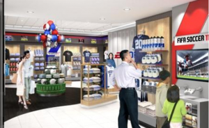 Electronic Arts, leader des jeux vidéo développe actuellement un concept de magasins mixant jeux, accessoires et vêtements de sports d’équipes locales destiné aux aéroports et aux croisières.