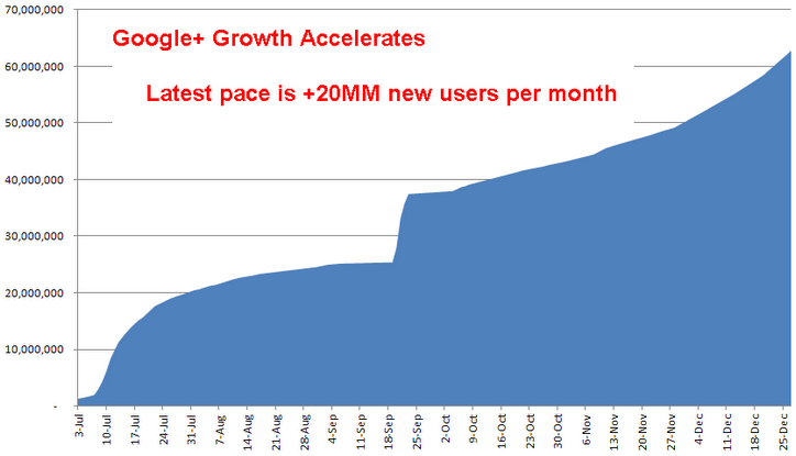 D’après Paul Allen, l’analyste « non officiel » de Google +, le réseau social de Google atteindrait les 62 Millions d’utilisateurs et ajouterait près de 625.000 nouveaux utilisateurs par jour.