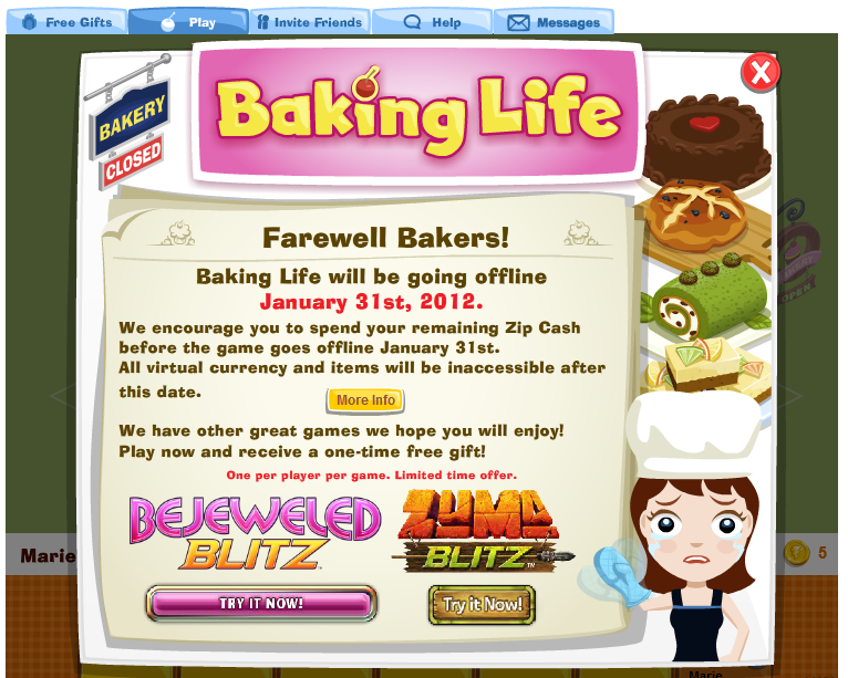 Electronic Arts fait le ménage dans ses filiales. PopCap sa filiale, rachetée cet été pour 760 Millions $ vient de fermer le jeu Baking Life lancé en mai 2010.