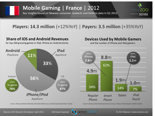 D’après cette même étude, la France compterait 14,3 millions de joueurs mobiles dont 64% sur smartphones et 12% sur tablettes.