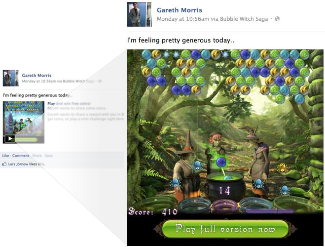 Le réseau social vient de dévoiler «Feed Gaming» une fonctionnalité permettant aux joueurs de jouer dans leur propre timeline à des versions miniatures des jeux sociaux. Une nouvelle possibilté déjà testée par Rovio sur Angry Birds, Idle Games avec Idle Worship et King.com sur Bubble Witch Saga.