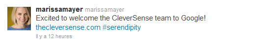 En décembre, lors du rachat de Clever Sense par Google, Marissa Mayer, directrice des produits s’était même réjouie de cet achat d’une manière transparente sur Twitter, citant nommément dans son hashtag la serendipité.