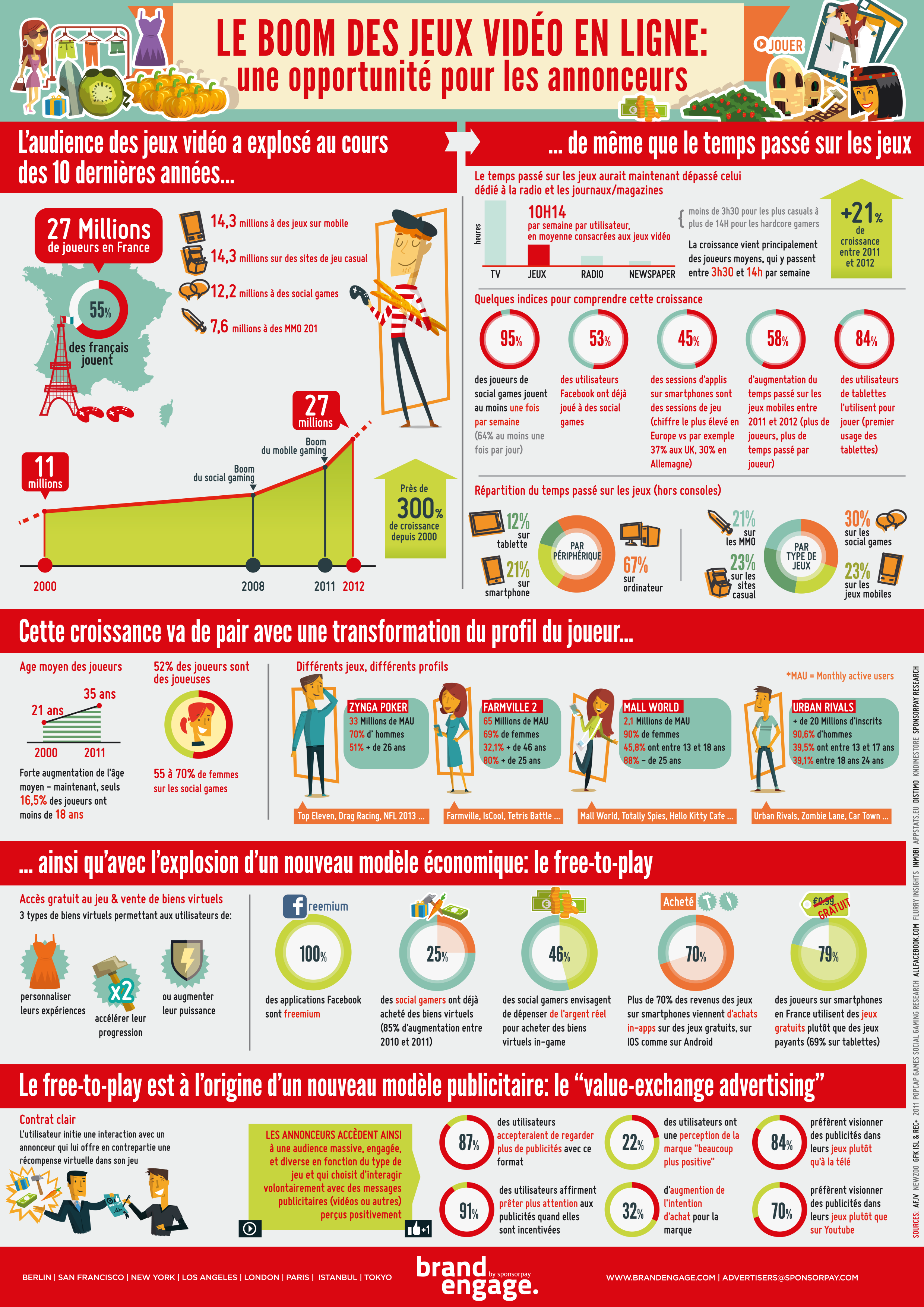 SponsorPay, le leader de la monétisation dans les jeux mobiles et sociaux vient de publier une infographie sur le boom des jeux vidéos en ligne sur le marché Français. On y apprend que la France compte 27 millions de joueurs dont 14,5 millions de joueurs mobiles.