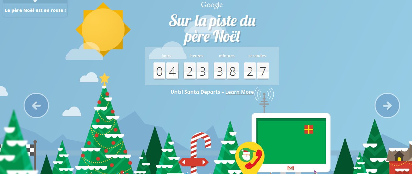 Dans quelques jours le Père Noël commencera son périple tout autour du monde. Google qui traquait jusqu’à présent le trajet du Père Noël avec la Norad (aujourd’hui partenaire de Bing) vient de « locker » le Père Noël dans son écosystème et permet grâce à son Tracker de Père Noël sur son nouveau site "Sur la piste du Père Noël" de suivre son cheminement tout autour du Globe sur Google Maps.