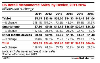 De leur côté, les ventes sur tablettes devraient représenter 24 milliards de dollars aux Etats-Unis en 2013 en hausse de 73% constituer 9,4 % du commerce en ligne.