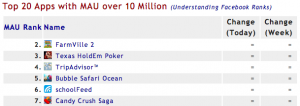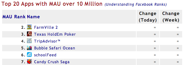Grâce à ses bonnes performances à la fois sur sur les plateformes mobiles et sociales, le jeu casual de King.com, Candy Crush Saga est devenu le jeu le plus populaire sur Facebook, devançant les titres phares de Zynga, Farmville 2 et Texas Holdem Poker.