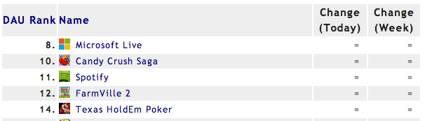 Selon AppData, King.com devance Zynga avec Candy Crush Saga sur le nombre de joueurs actifs quotidiens (Candy Crush Saga attire 9.7 millions de joueurs quotidiens quand FarmVille 2 en attire 8.8 millions et Texas HoldEm Poker en attire 7.1 millions.)