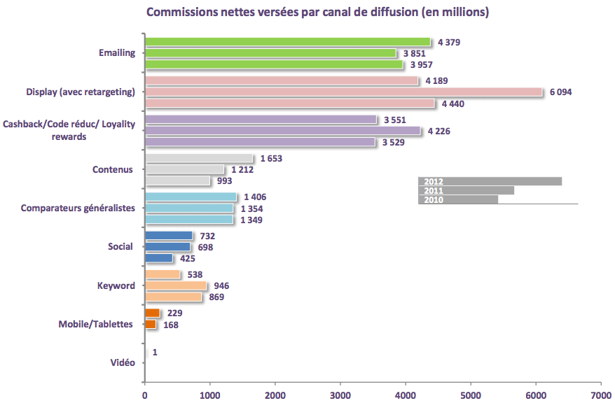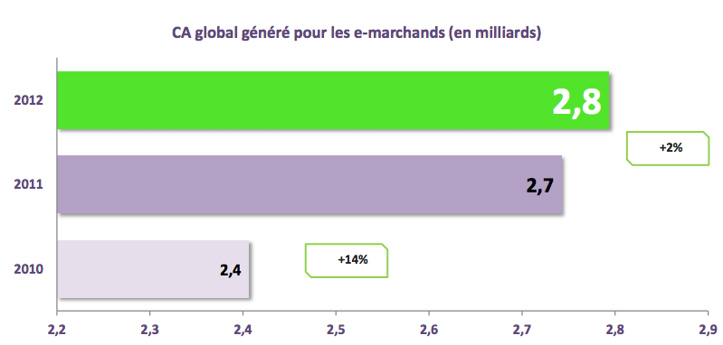 Concernant le e-commerce, on apprend que malgré une baisse du panier moyen, l’affiliation a généré 2,8 milliards € de CA pour les e-marchands en 2012.