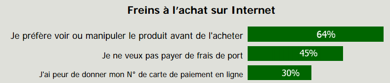 #3 : A l’inverse, 2 principaux freins subsistent : l’impossibilité de voir ou de manipuler le produit avant de l’acheter et le montant des frais de port. Logiquement, les motivations principales d'achat en magasins physique sont la possibilité de voir, toucher, essayer les produits (51% le citent comme raison principale) et de pouvoir disposer du produit immédiatement.