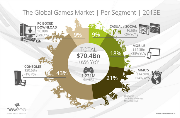 Newzoo estime que le marché global des jeux (Pc, consoles, sociaux et mobiles) s’élévera à 70,4 milliards de dollars en 2013 en hausse de 6%. Le marché des jeux sur consoles représente 43% du marché et demeure encore le premier segment des jeux vidéos avec 30,4 milliards de dollars en baisse de 1%.