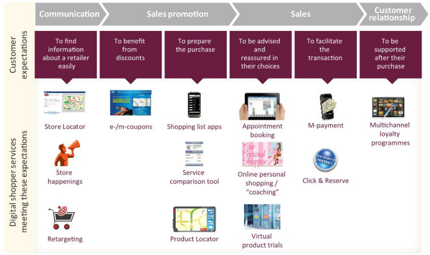 Une étude publiée par Cap Gemini a ainsi identifié 13 services Web to Store permettant de répondre aux attentes des consommateurs effectuant leur achats dans les magasins et cela tout au long de leur parcours d'achat.