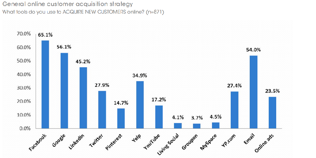 En termes de canaux marketing d’acquisition il sont 65,1% à utiliser Facebook, 56,1% Google, 54% l’email,, 45,2% Linkedin, 34,9% yelp, 14,7% Twitter, 27,4% les « Yellow Pages » et 14,7% Pinterest.
