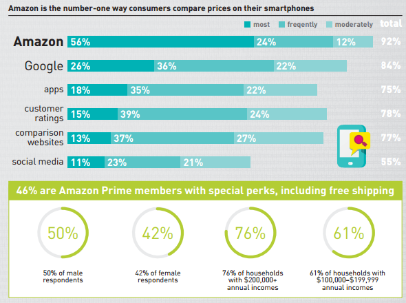 L’étude souligne qu’Amazon est le premier site sur lesquels les consommateurs effectuent leurs comparaisons de Prix, deux fois plus que sur Google. Une pratique qui s’intensifie en faveur d’Amazon, plus le revenu moyen des personnes interrogées progresse.