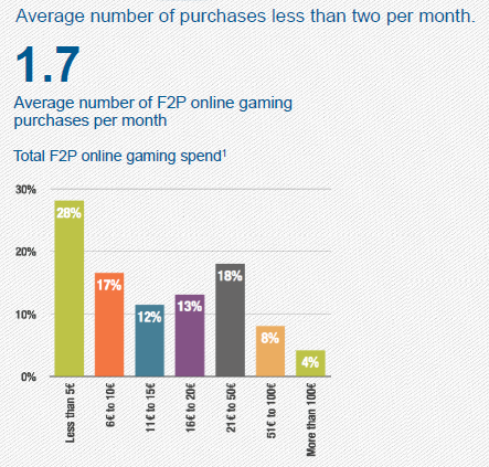 A contrario 7% de joueurs "casuals" dépensent moins de 5 Euros sur des options de jeux. Sur les jeux sociaux 73% des joueurs dépensent moins de 10 Euros.