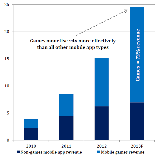 En termes de chiffre d'affaires, les jeux mobiles accaparent 72% du revenu total des Apps contre 40% en 2010.