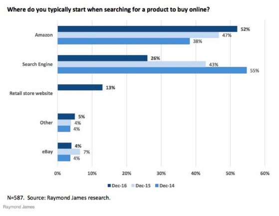 De l’intention à l’action...Selon une étude menée par Raymond James aux Etats-Unis, 52% des recherches produits démarraient sur Amazon contre 26% sur les moteurs de recherche en décembre 2016.