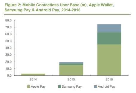 En juillet 2016, Tim Cook avait confié qu’Apple représentait 75% des paiements NFC aux US. Selon l’analyste Nithin Bas, auteur de l’étude, la proportion de magasins aux Etats-Unis supportant Apple Pay est passée de 4% en 2014 à 35% fin 2016. L’analyste s’attend à un déploiement similaire dans les prochaines années sur les marchés Européens.