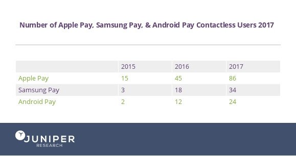 Le nombre d’utilisateurs sur les services de paiements mobiles sans contact d’Apple, Google et Samsung devrait passer de 86 millions en début d’année à 150 millions fin 2017 selon la dernière étude publiée par Juniper Research.