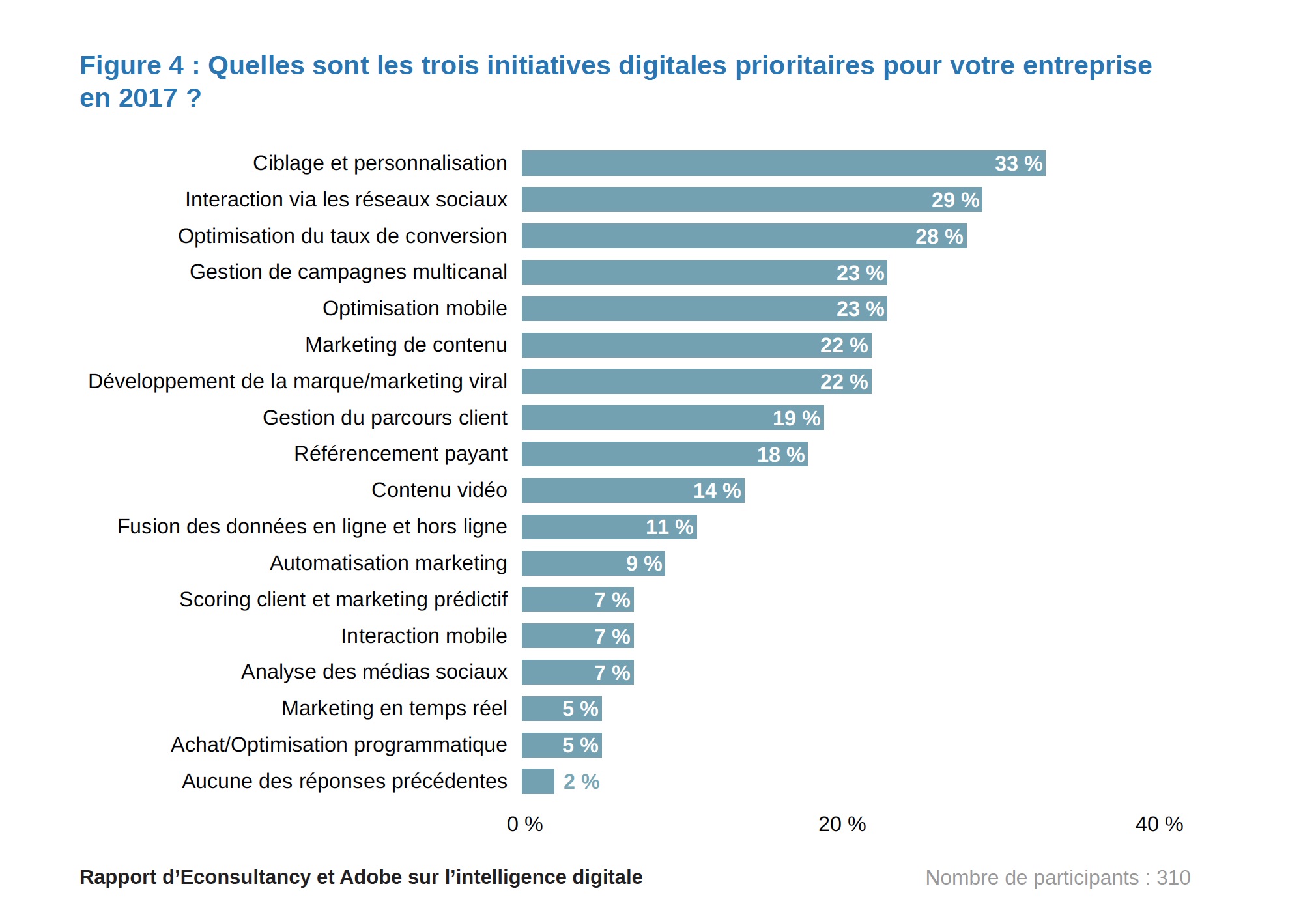 Ciblage et personnalisation vont de pair avec l’expérience client. Et c’est donc logiquement qu’elles sont la priorité parmi les initiatives digitales en 2017 (33%), devant les interactions via les réseaux sociaux (29%) et, autre versant de l’expérience client, l’optimisation du taux de conversion (28%), et loin devant toute autre initiative.