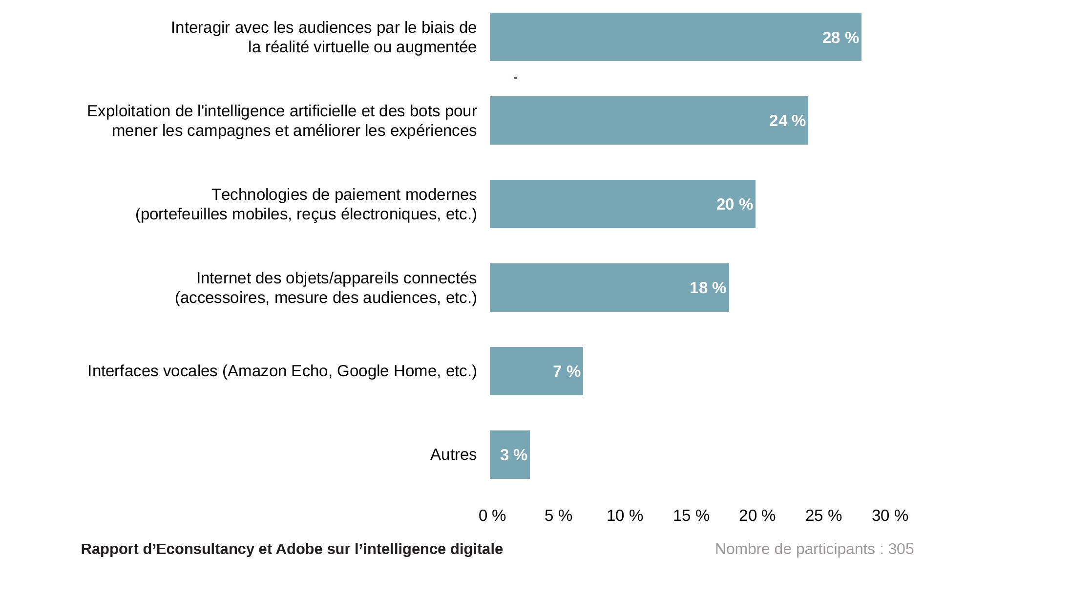 S’ils ne misent pas prioritairement sur l’innovation pour se démarquer, les distributeurs établissent une hiérarchie claire en ce qui concerne leurs technologies de dmain préférées. C’est en effet la réalité virtuelle ou augmentée qui se distingue, un choix lié certainement à l’importance accordée au point de vente physique, dont l’AR et la VR permettent d’enrichir l’expérience.