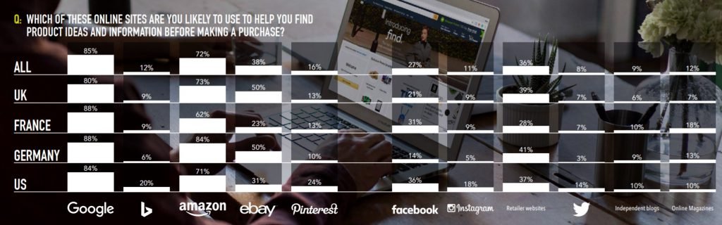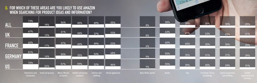 Amazon se place derrière Google à 85% et loin devant Ebay à 38%, Facebook à 27% et Pinterest à 16%. L’étude souligne que la proportion d’utilisateurs effectuant une recherche sur Amazon est de 62% en France alors qu’elle est de 84% en Allemagne…