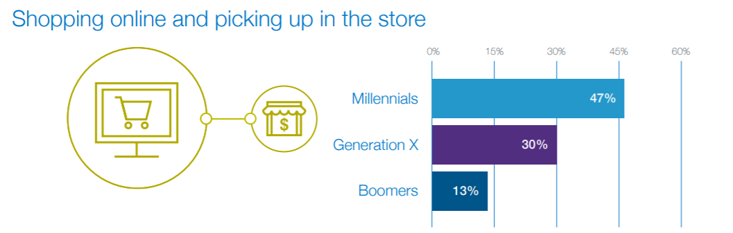 Ils sont également de fervents partisans du Get in/ Get out donc du Shop Online Pick Up in Store à 47% contre 30% pour la génération X et 13% pour les Boomers.