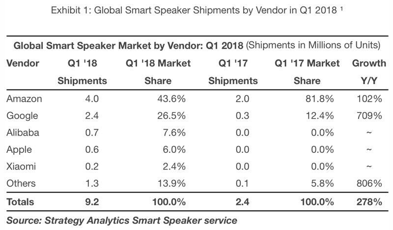 Au total 9,2 millions d’enceintes connectées ont été vendues au premier trimestre. L’étude note par ailleurs que la part de marché de Google et Amazon serait tombée de 84% à 70% en un trimestre.