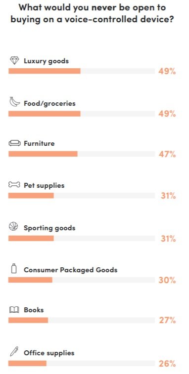 Les catégories favorites d’achat via voice commerce sont : Le luxe, les fruits et légumes et les meubles et les produits pour animaux domestiques :