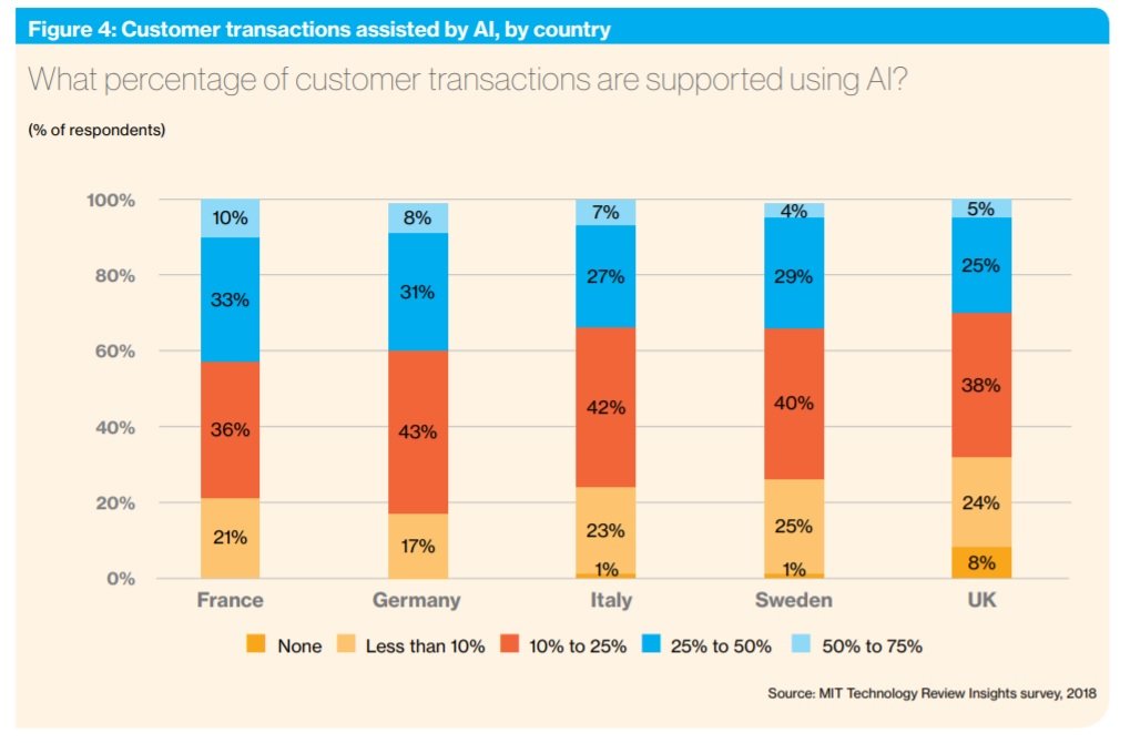 En France, par exemple 43% des sociétés interrogées déclarent utiliser l’intelligence artificielle dans 25 à 75% des transactions :