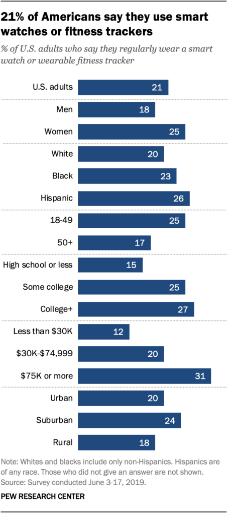 Le Pew Research Center vient opportunément de publier des chiffres éclairants. 21 % des américains adultes portent une montre connectée ou trackers de santé. Les plus gros utilisateurs seraient les femmes éduquées et à fort revenus.