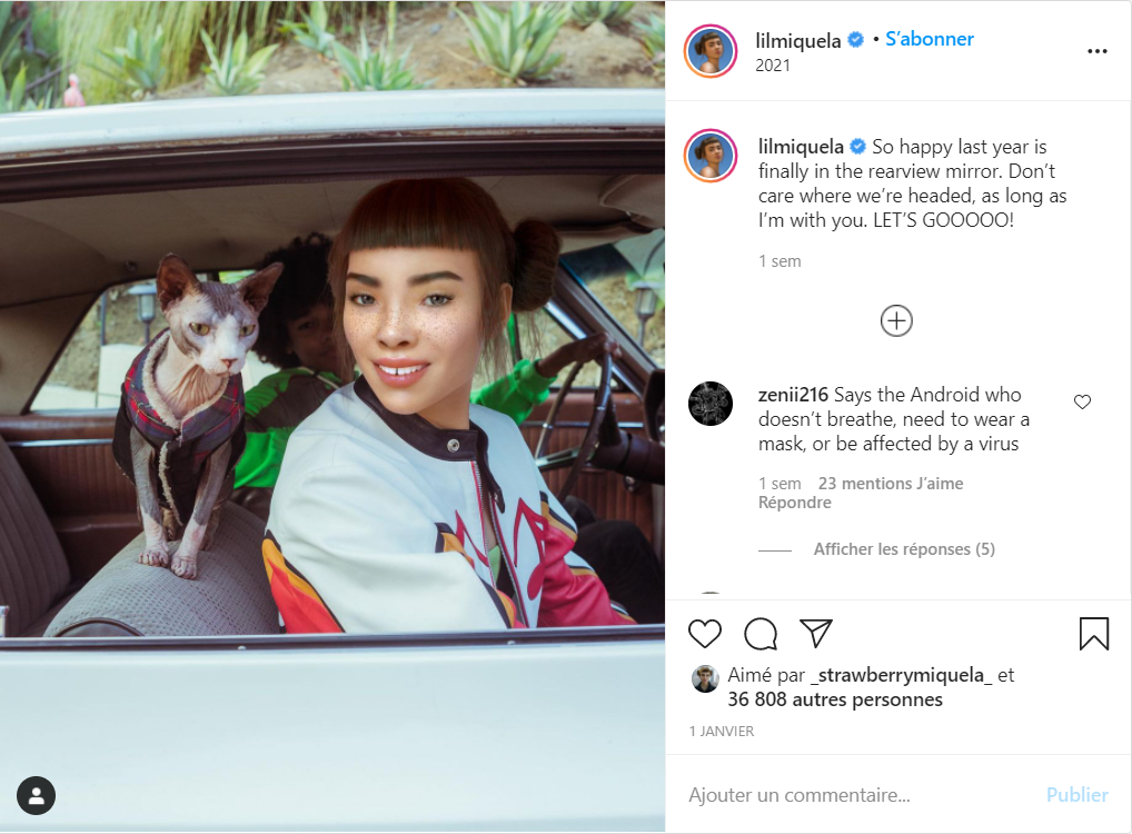 L’influenceuse virtuelle et instagrameuse Lil Miquela n’a pas pris une ride depuis son arrivée en 2016 sur les réseaux sociaux. Considérée comme la première mannequin virtuelle au monde, et classée en 2018 parmi les personnalités les plus influentes d’internet par le magazine « Time », Lil Miquela pourrait avoir éternellement 19 ans. Elle est suivie par près de 3 millions de personnes, et courtisée par les marques pour leur campagnes sponsorisées.