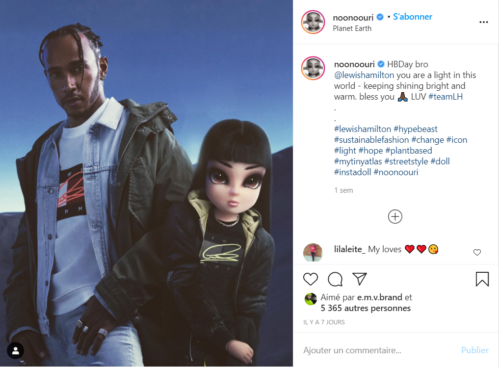 Dans un autre registre d’inspiration manga japonaise, Noonoouri, créée par l’agence de design Opium 371 000 abonnés). Sa dernière campagne en décembre la mettait en scène avec Lewis Hamilton, le champion de F1 multipliant depuis plusieurs années les collaborations dans l’univers de la mode et du streetwear, notamment avec Tommy Hilfiger.