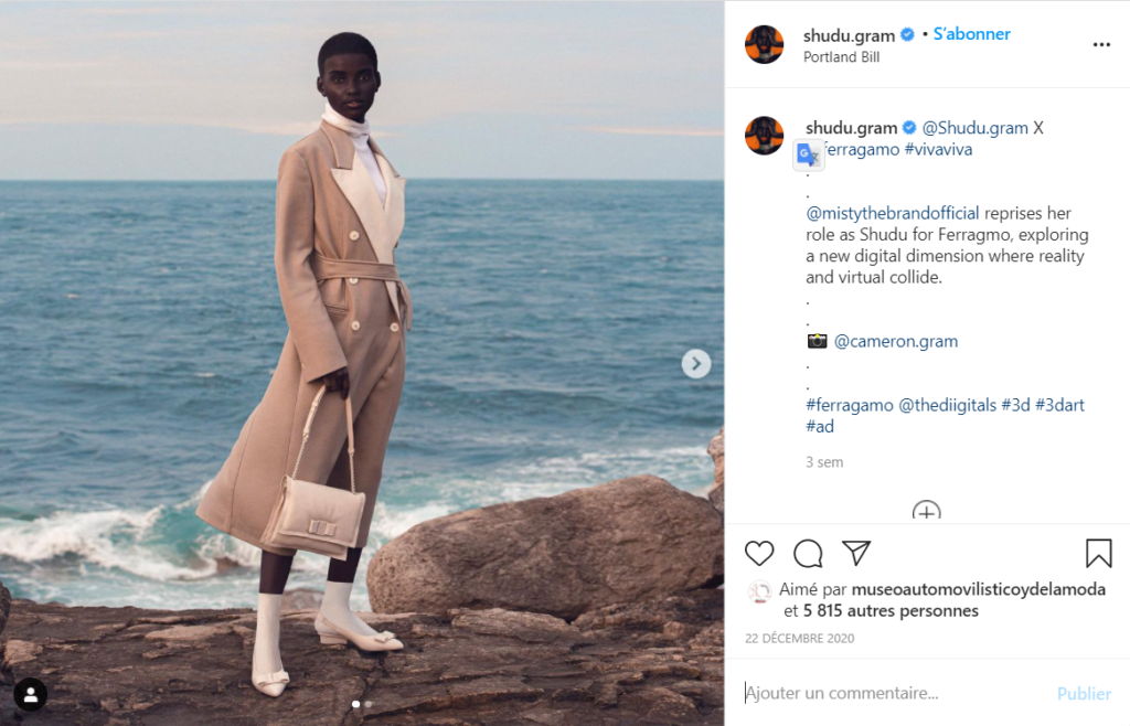 D’autres mannequins virtuels sont nés dans le sillage de Lil Miquela. Citons Shudu Gram, lancée en 2017, qui compte aujourd’hui 211 000 abonnés sur Instagram, et une campagne en décembre 2019 avec Ferragamo.