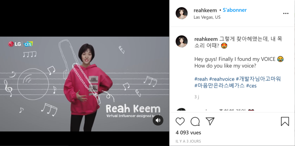 Au CES 2021, la multinationale sud-coréenne LG avait totalement virtualisé la conférence de présentation de ses nouveaux produits. L’animation avait été confiée à une influenceuse virtuelle, Reah Keem, à l’apparence d’une jeune femme qui se présente comme musicienne et DJ.