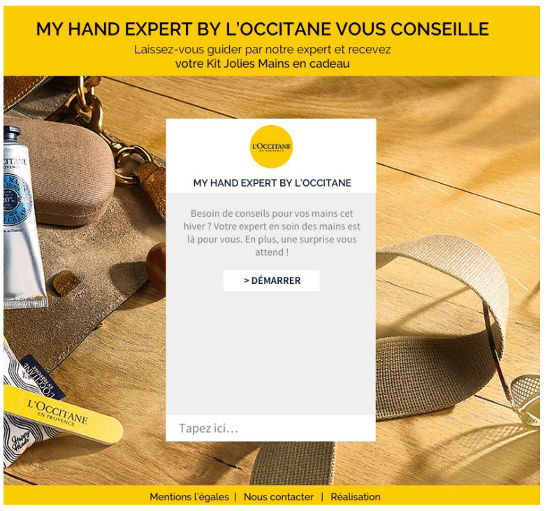 Autre exemple intéressant avec le chatbot « My hand expert » de l’Occitane, développé par Numberly (groupe 1000mercis). A travers la découverte d’une routine beauté, avec un jeu de questions et réponses, les clientes sont amenées à partager leurs données de contact pour bénéficier de codes promotionnels. Le temps moyen d’interaction des clients avec le chatbot serait de 1’35 min. Le résultat : 69% des inscrits ont partagé leurs données de contact avec le bot. Le dispositif a aussi généré des ventes avec 35% des participants ayant utilisé leur code promo en point de vente ou en ligne. (détails sur le site de Numberly)