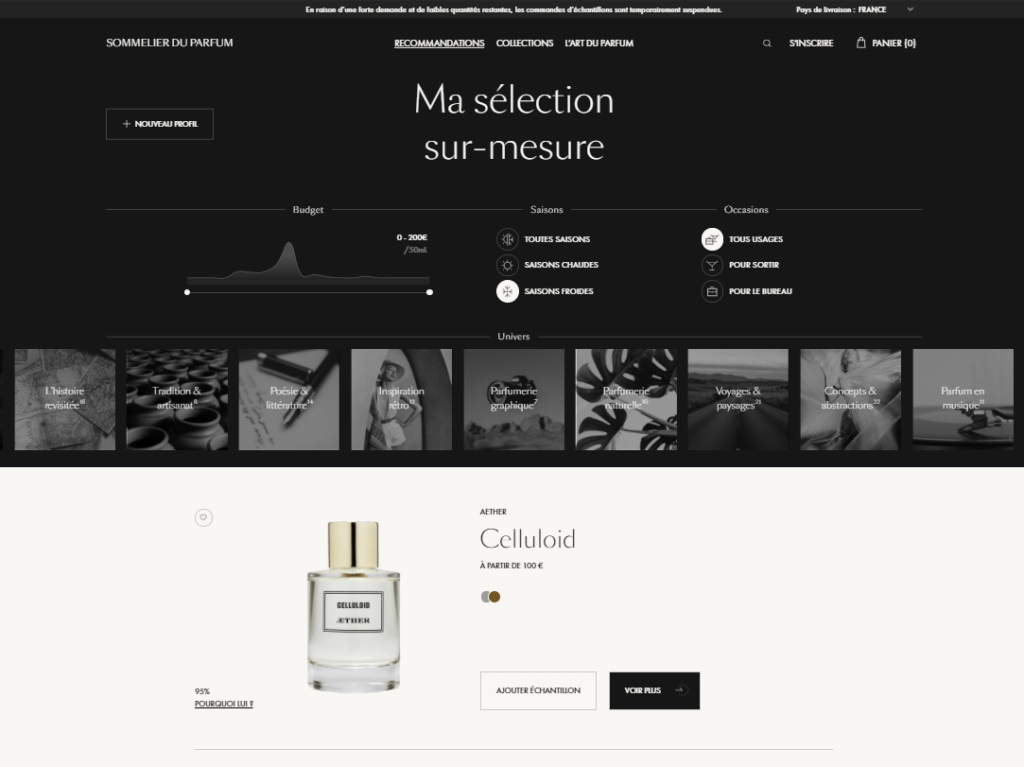 Avec le chatbot, le consommateur était invité à renseigner différents critères pour être orienté dans le très vaste choix de parfums disponibles. Une expérience qui aura certainement permis à « Sommelier du parfum » de collecter des données utiles pour comprendre l’adéquation entre l’offre et les goûts des consommateurs. Aujourd’hui avec son application l’entreprise oriente les clients vers une sélection de partenaires, marques de niche comme The Different Company, État Libre d’Orange, Olfactive Studio, J.U.S. Parfums. Pour 15 Euros, 5 échantillons de parfums recommandés sont envoyés aux clients. Un prix déduit de la prochaine commande sous forme de code de réduction. (Source Premium Beauty News). Hélas, actuellement, en raison d’une forte demande et de faibles quantités restantes, les commandes d’échantillons sont temporairement suspendues.