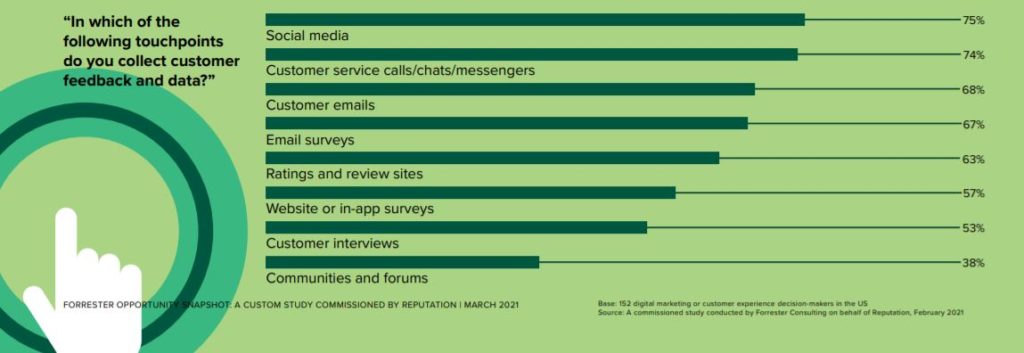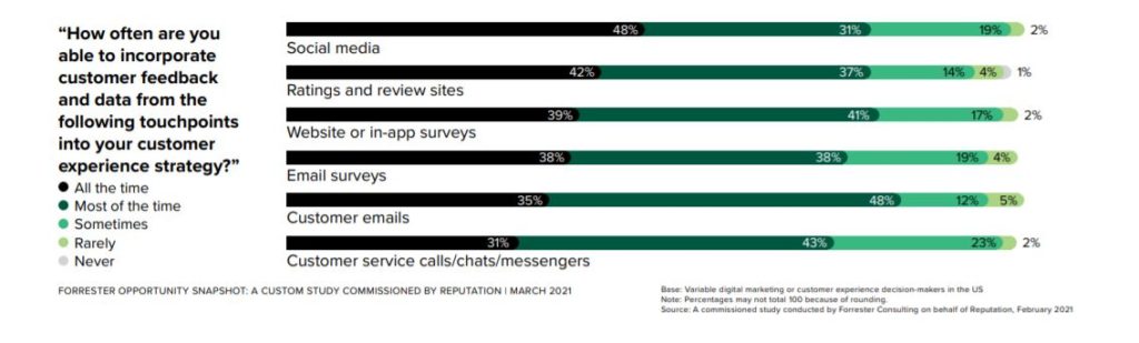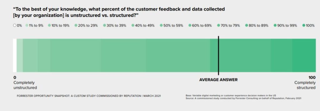 Un étude de Forrester Consulting, commanditée par l’éditeur américain Reputation, nous montre en fait que les entreprises exploitent encore peu les données non-structurées, à des fins de marketing ou d’amélioration de l’expérience client. (communiqué de l’étude, réalisée en février 2021 auprès de 152 décideurs en marketing digital ou en expérience client, aux Etats-Unis).