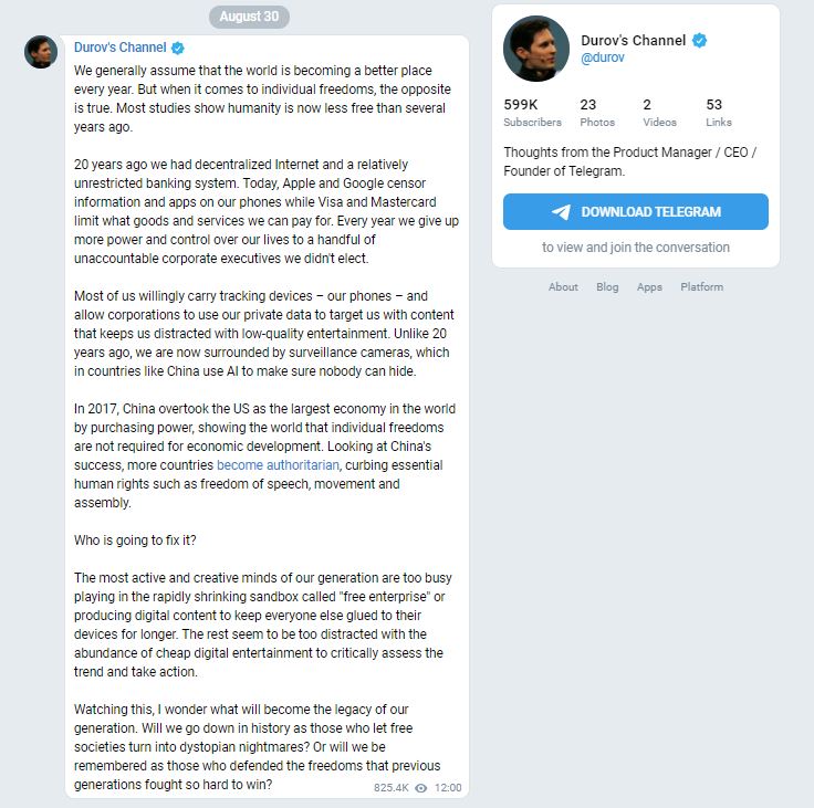 Pavel Dourov, co-fondateur de Telegram, a déjà clarifié sa position vis-à-vis de la censure. Un sujet clé pour de nombreux utilisateurs de messagerie, en particulier dans le contexte de la pandémie. Il a ainsi critiqué la politique de nombreux réseaux sociaux, Facebook en tête, de censurer des informations jugées erronées sur le Covid-19. Une méthode selon lui inefficace pour lutter contre la désinformation. (détails sur RT France)