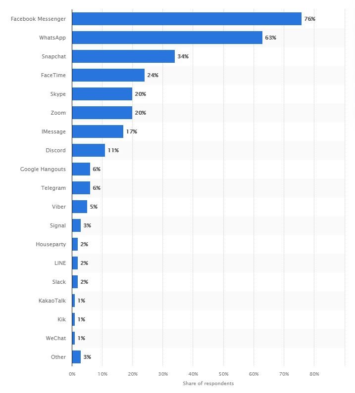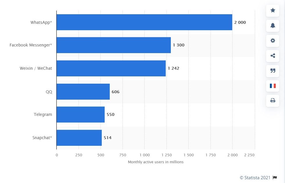 (Source Statista, Juillet 2021 : https://www.statista.com/statistics/258749/most-popular-global-mobile-messenger-apps/ )