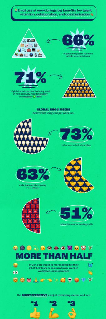 - 66 % des sondés français déclarent utiliser les émojis dans leurs conversations professionnelles, avec une incidence positive sur le partage d’idées (71 %), la sincérité ressentie dans les échanges (70 %), l’efficience de la prise de décision en équipe (59 %) et la réduction du besoin de réunions (48 %)